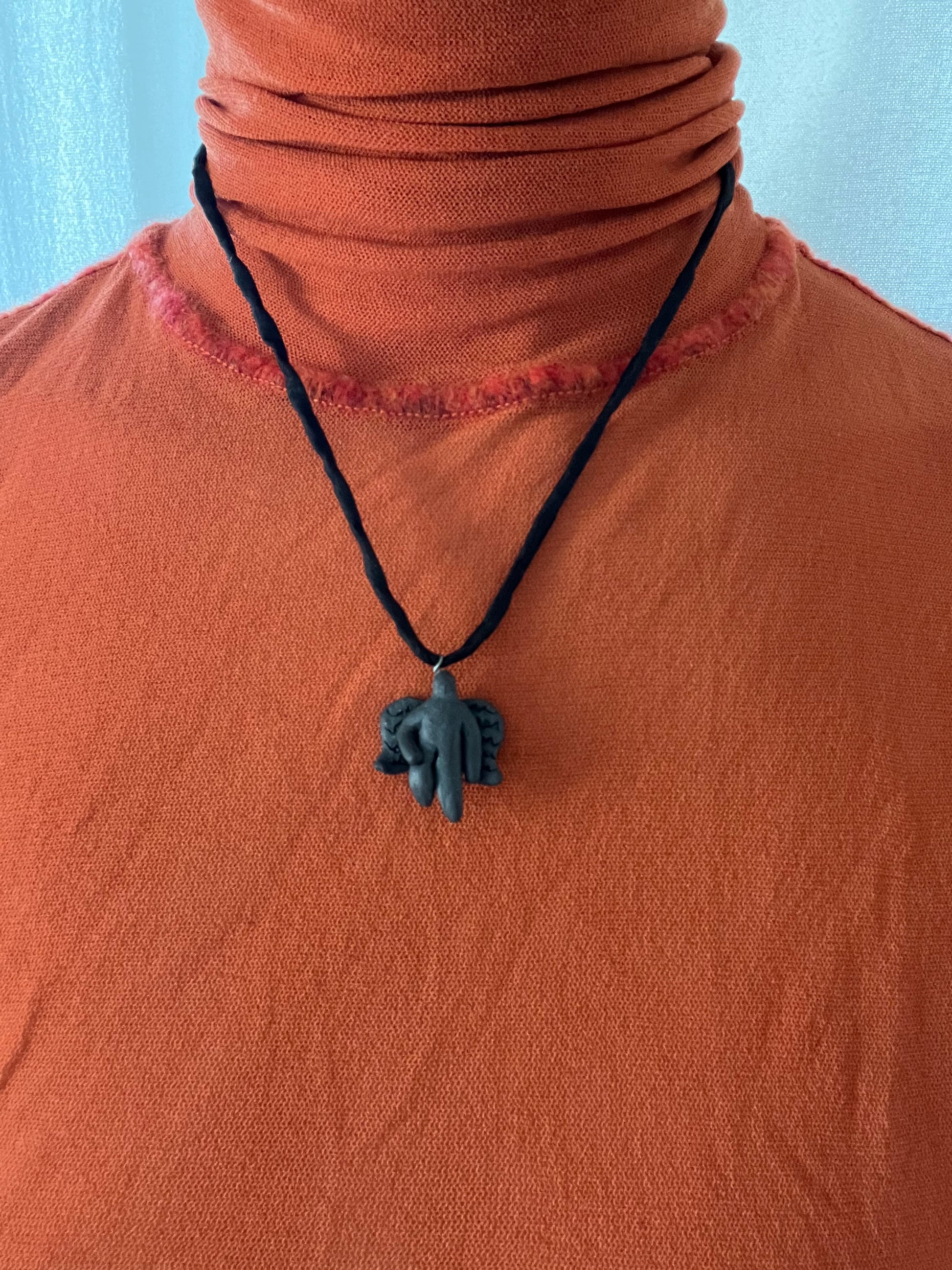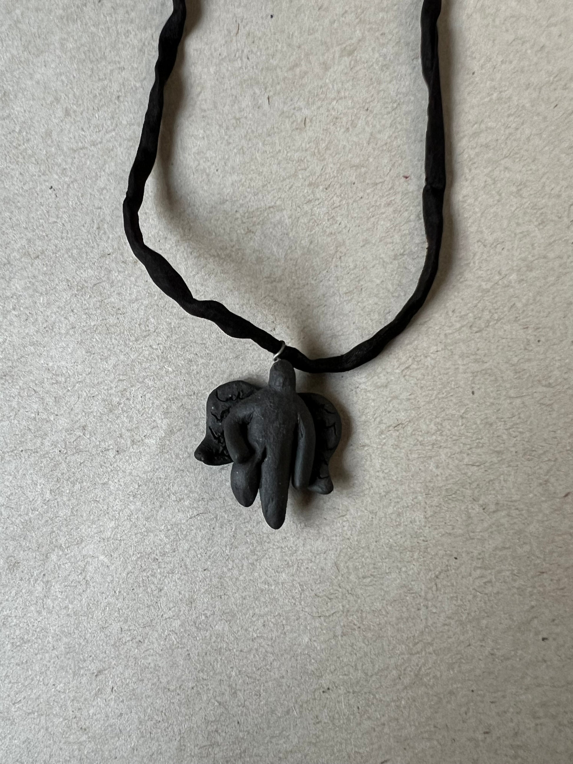 approximately 1” charm on an 18.5” hand dyed silk cord with handmade clay toggle closure.