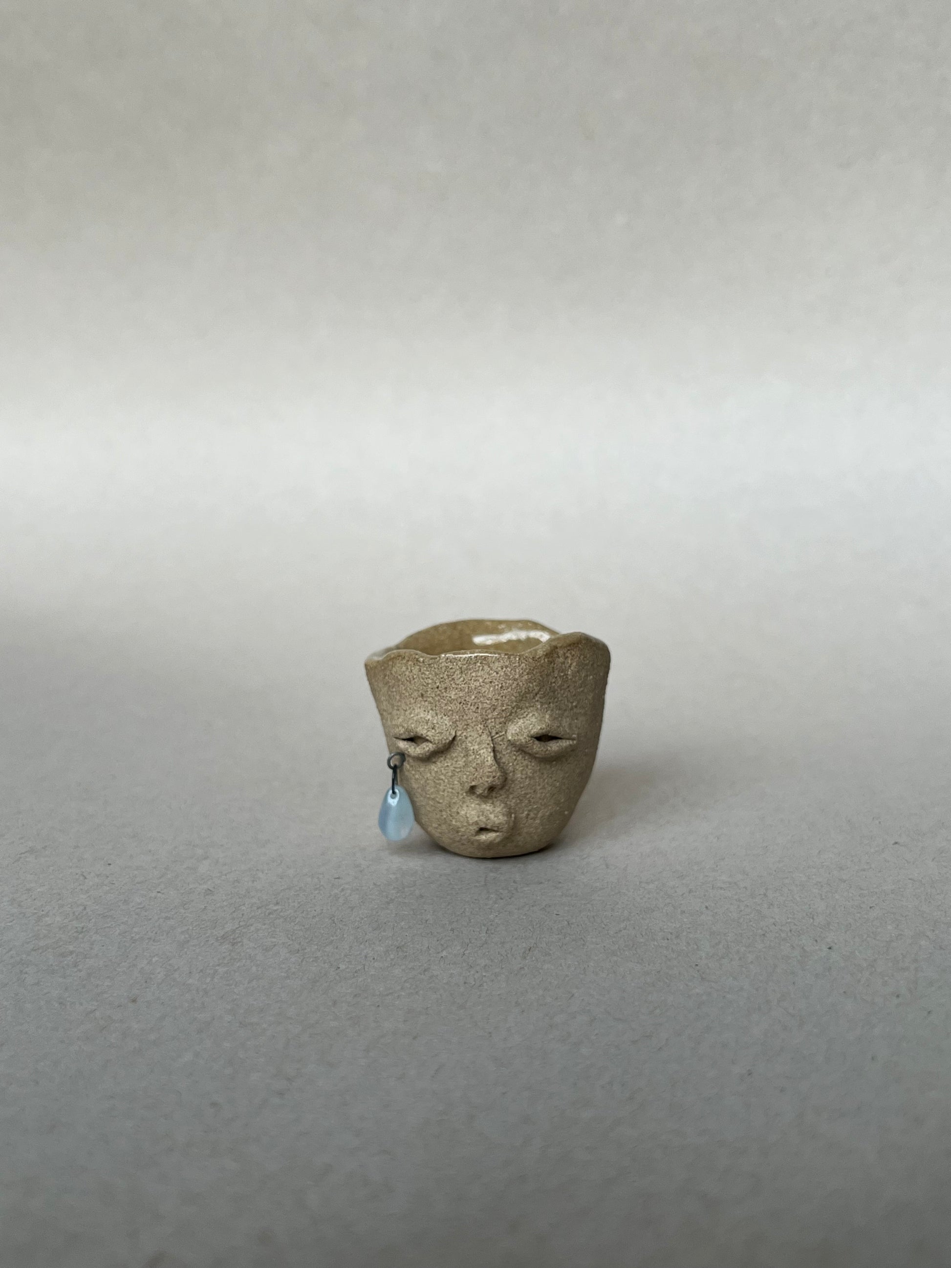 hand sculpted mini catchall with crystal teardrop detail. unglazed clay outside. textured to the touch. clear glazed inside for food safety.