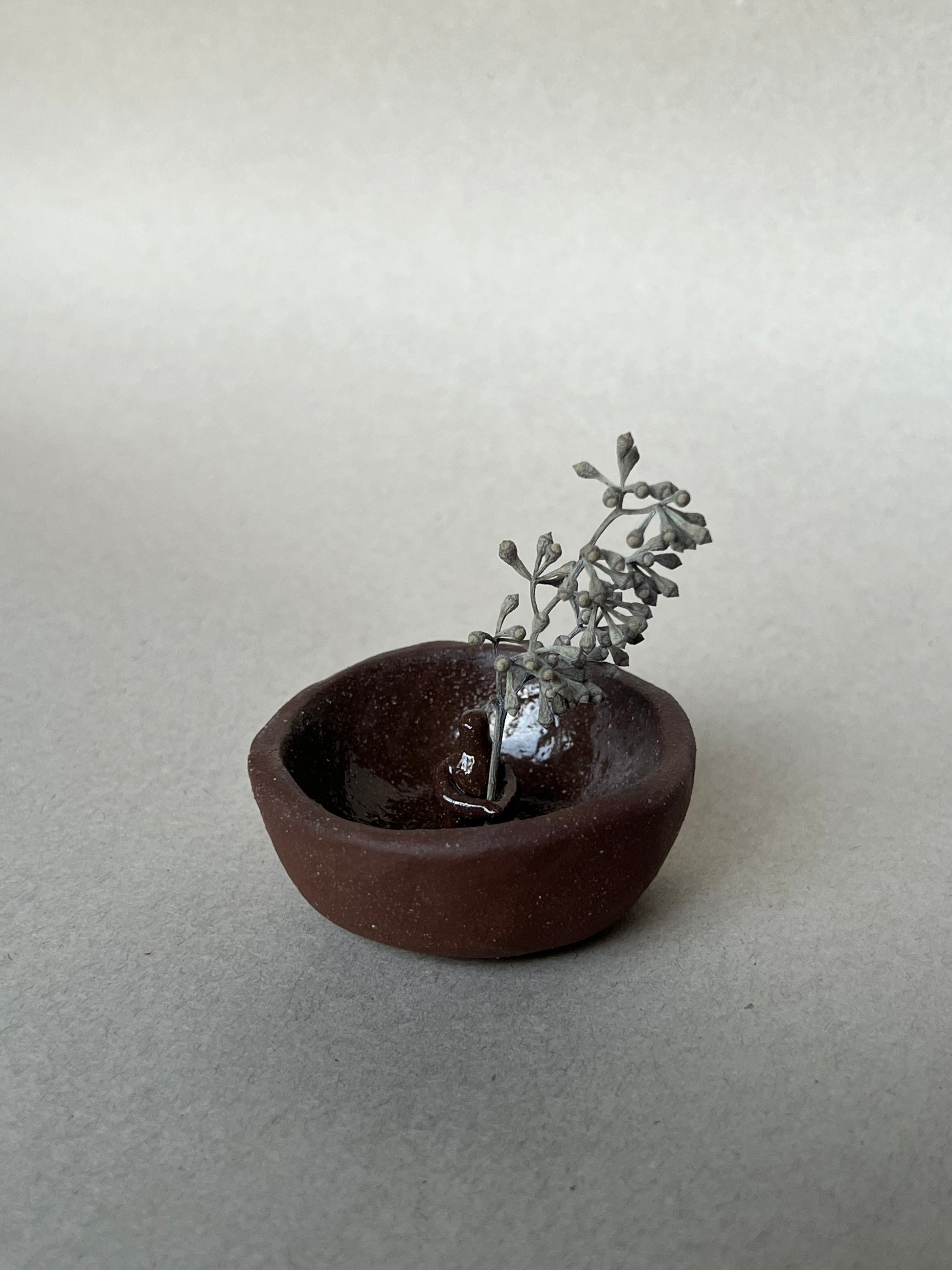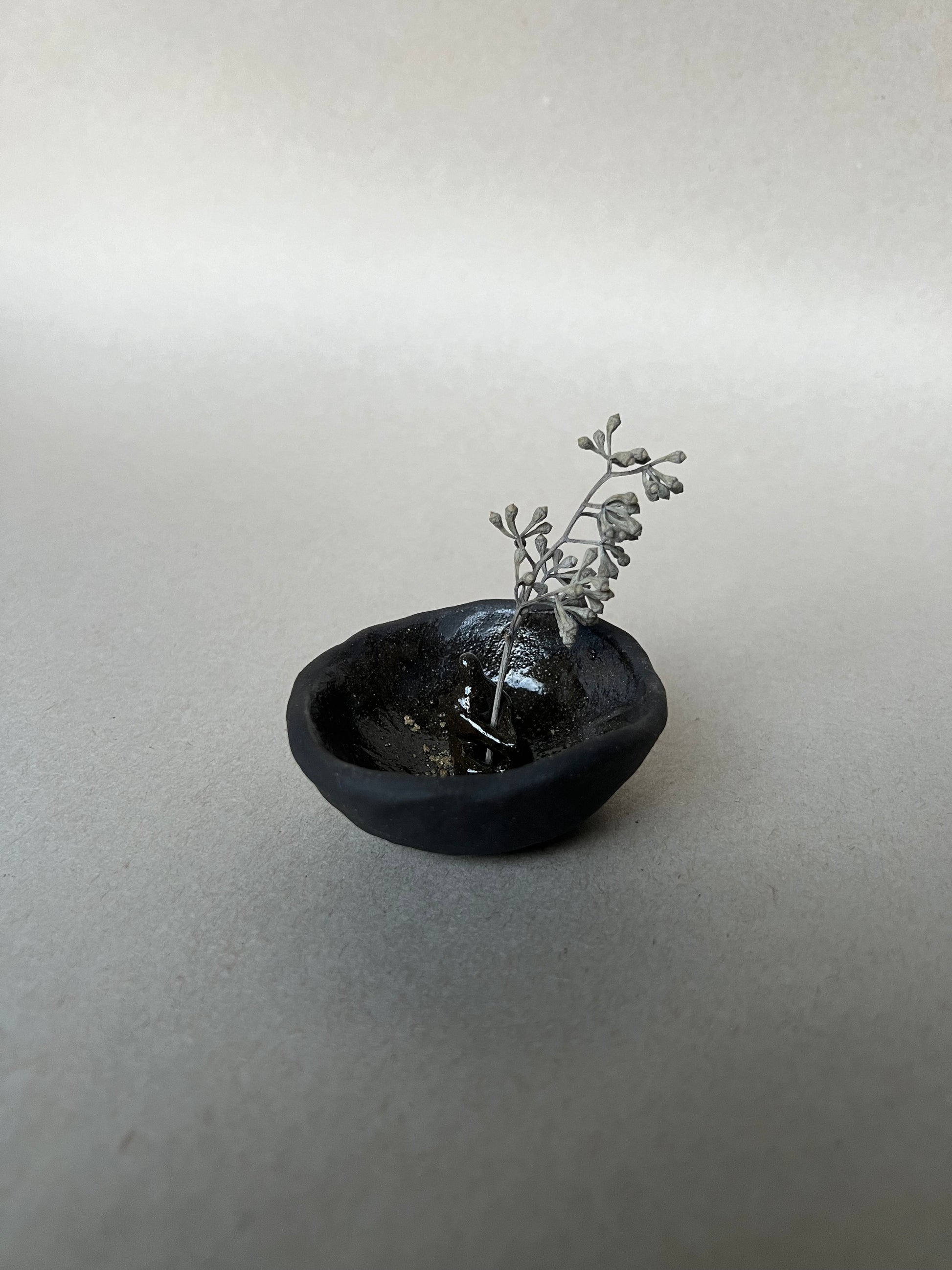 hand sculpted dish with miniature figure to hold incense or small bouquet. can also be used as a ring dish. unglazed clay outside. clear glazed inside for easy cleanup.