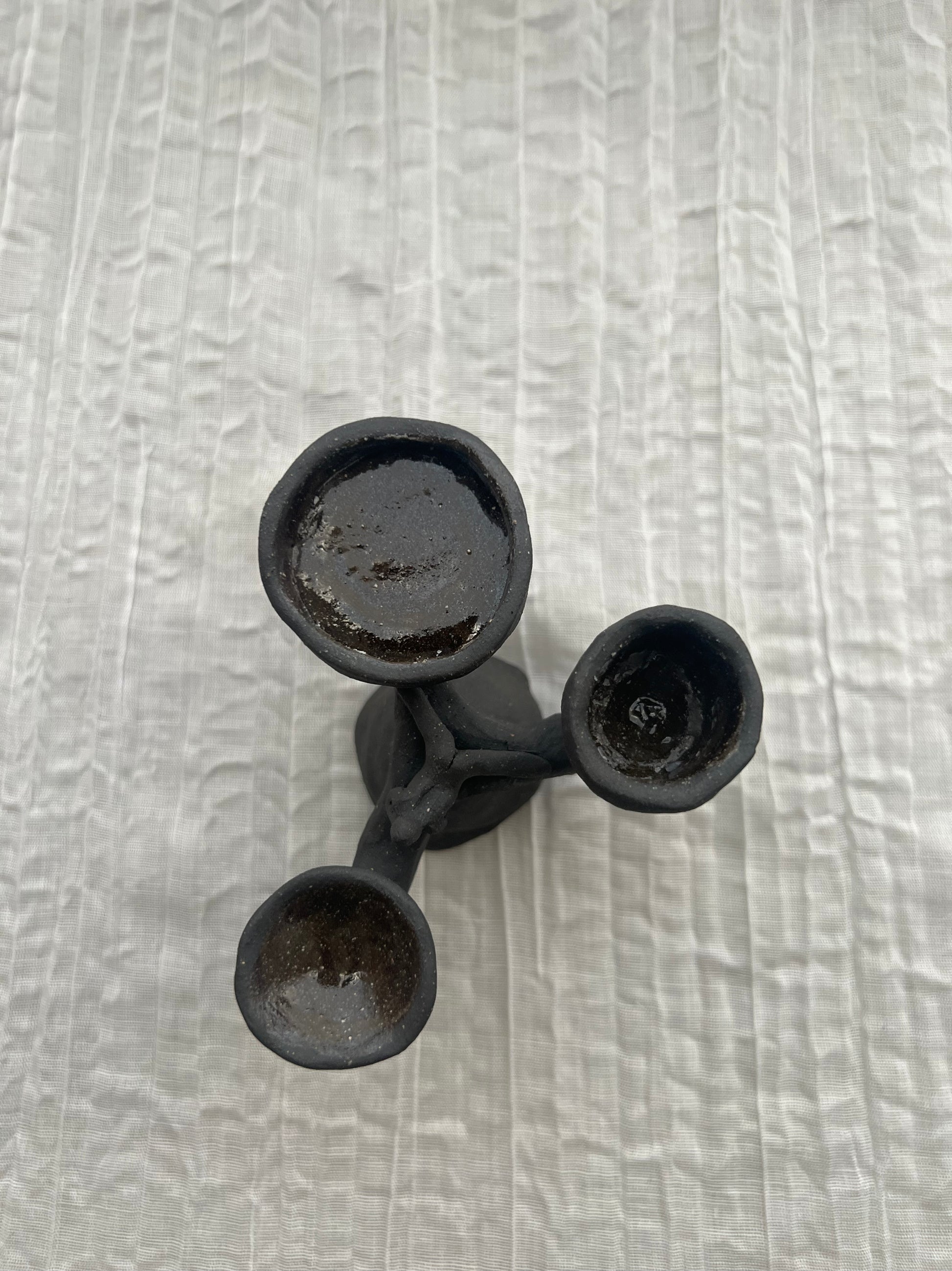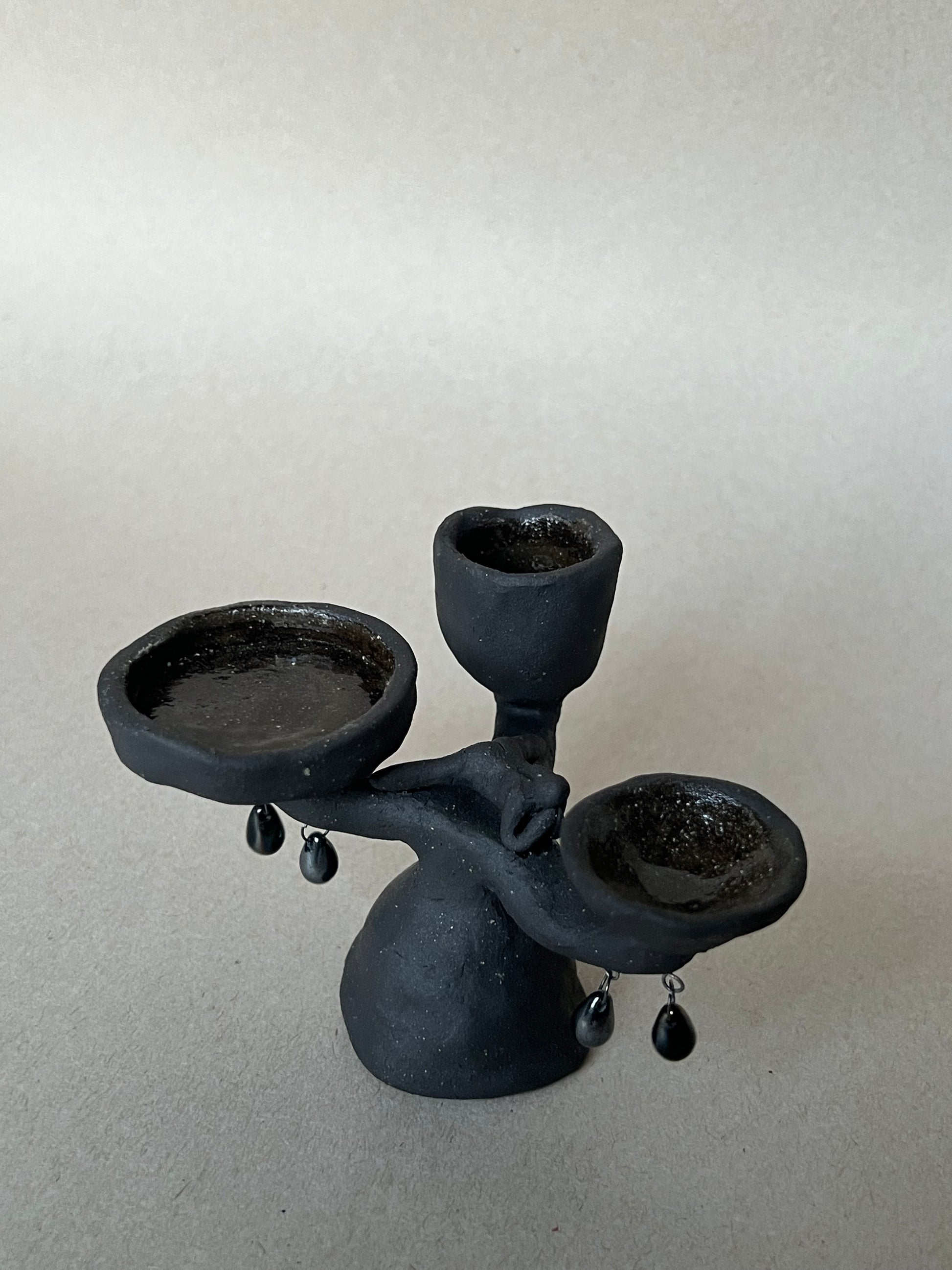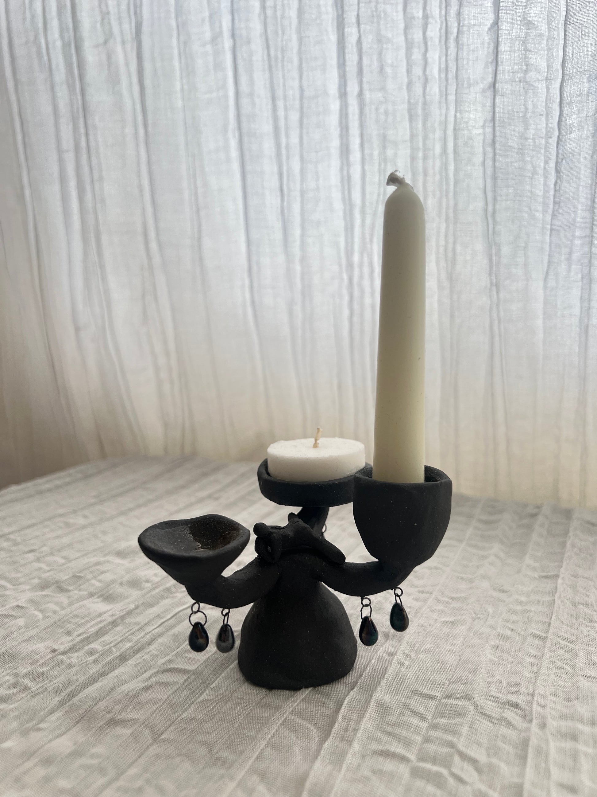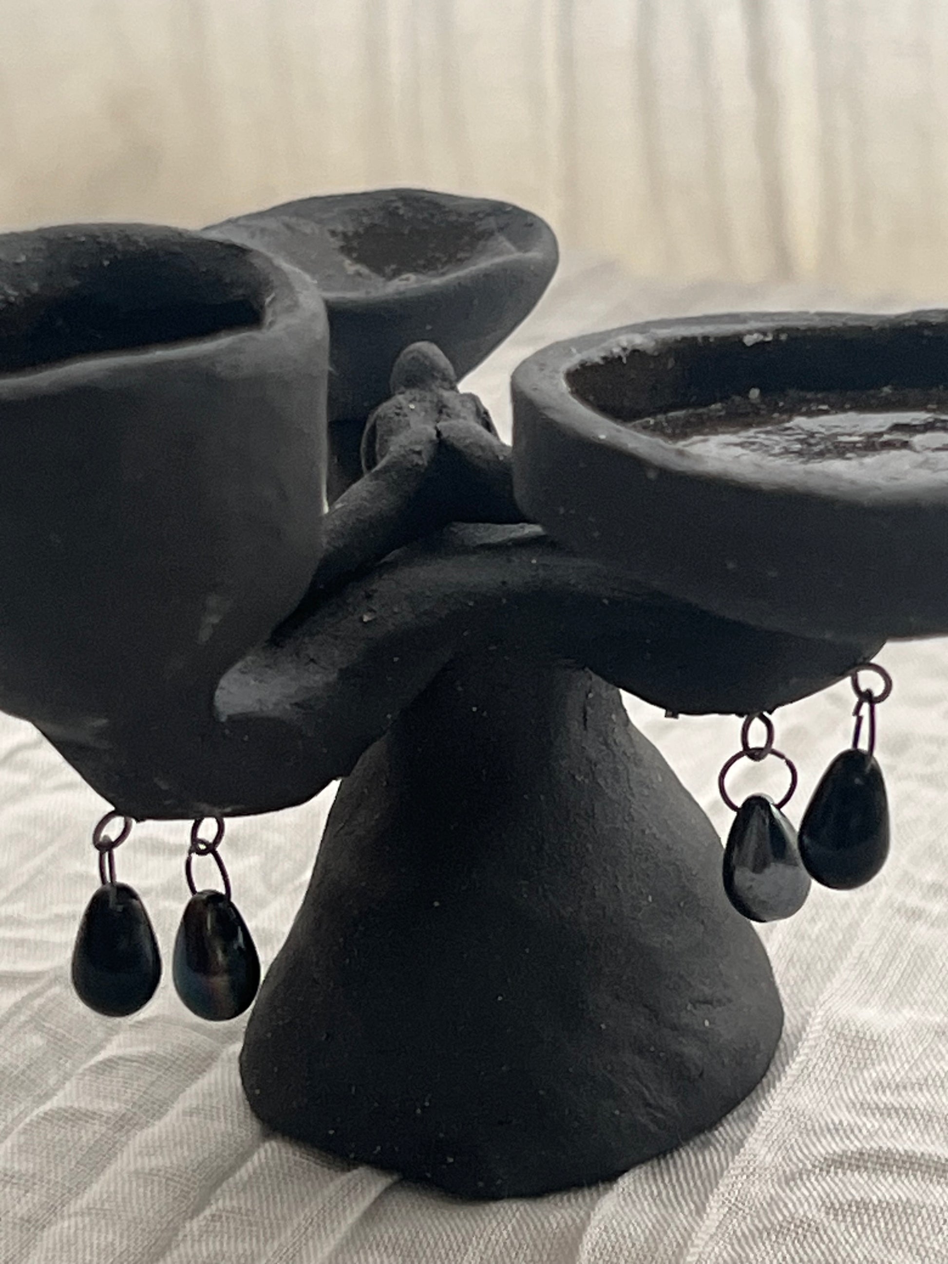 hand sculpted mini candelabra with body and teardrop crystal details. can fit a votive, candlestick, and incense cone. unglazed speckled onyx clay. clear glazed inside candleholders for easy cleanup.