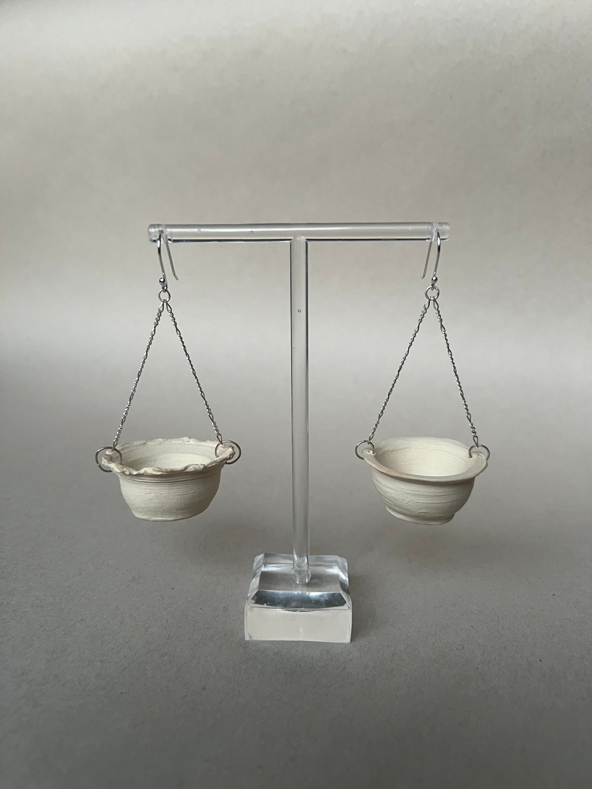 miniature bowl earrings. unglazed bone colored clay. sterling silver chain and earhooks.