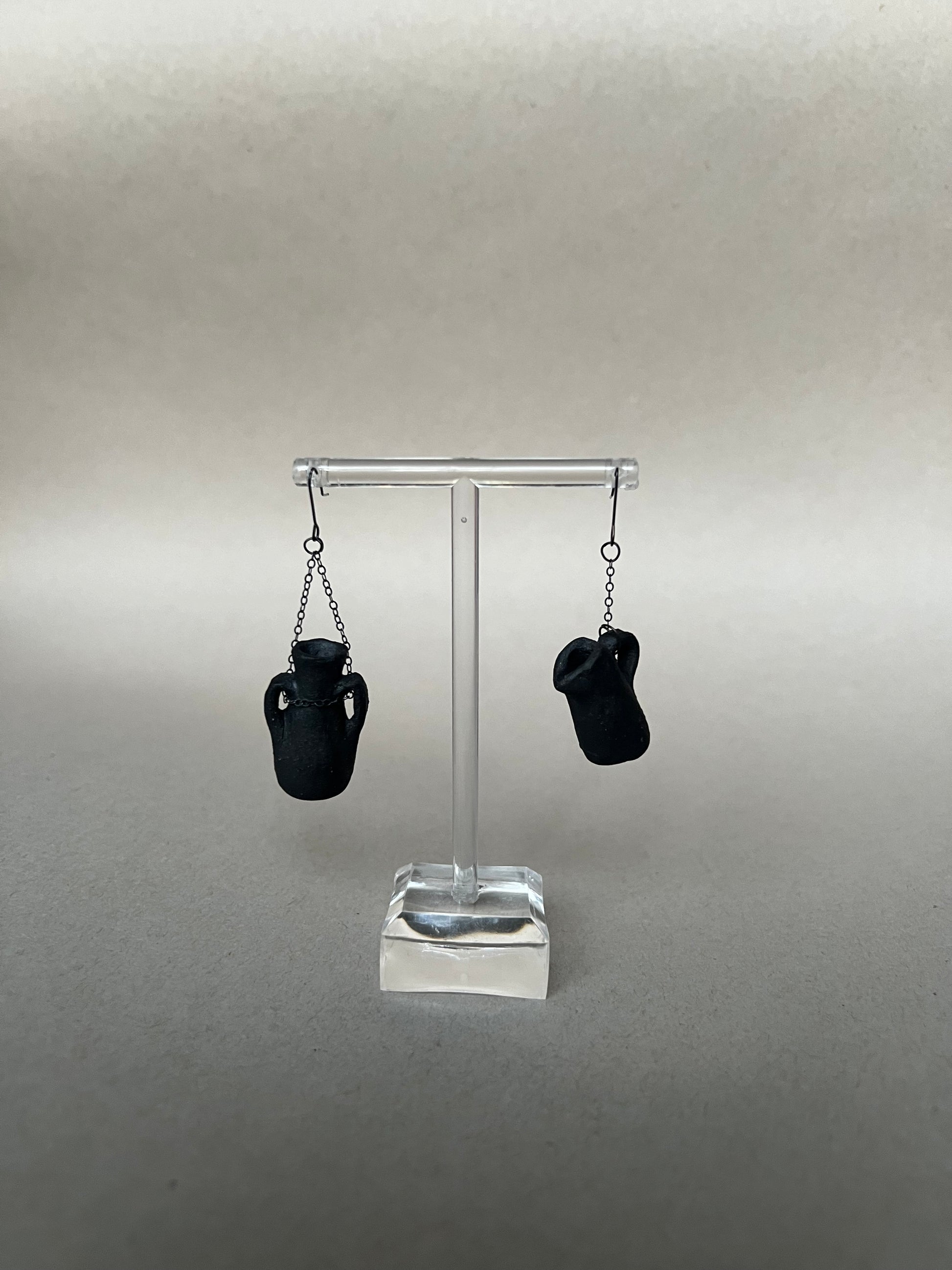 miniature functional vessel earrings. unglazed black clay. oxidized sterling silver chain and earhooks.