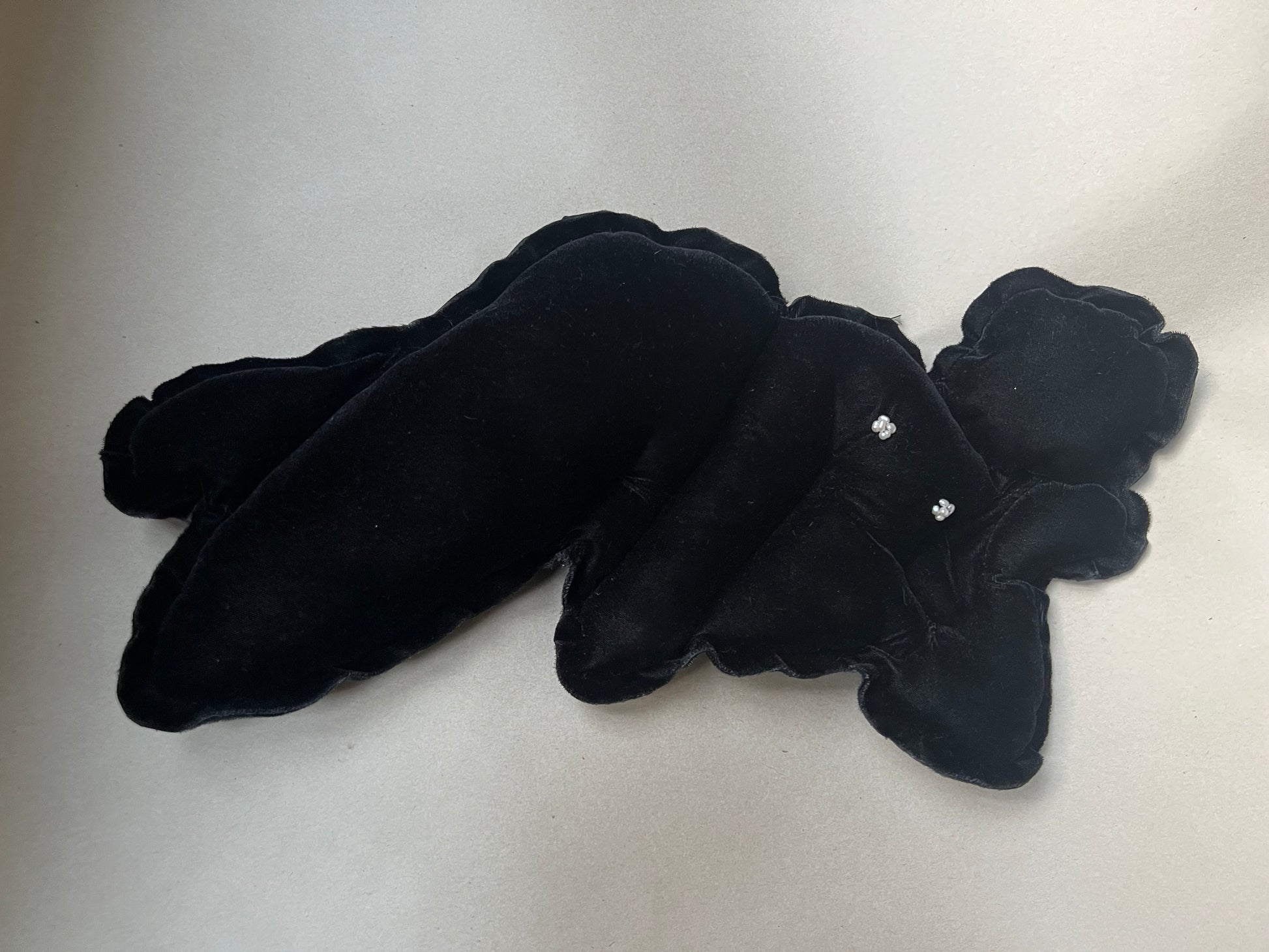 soft sculptural black velvet pillow with pearl details. has strap for optional use as wall hanging.